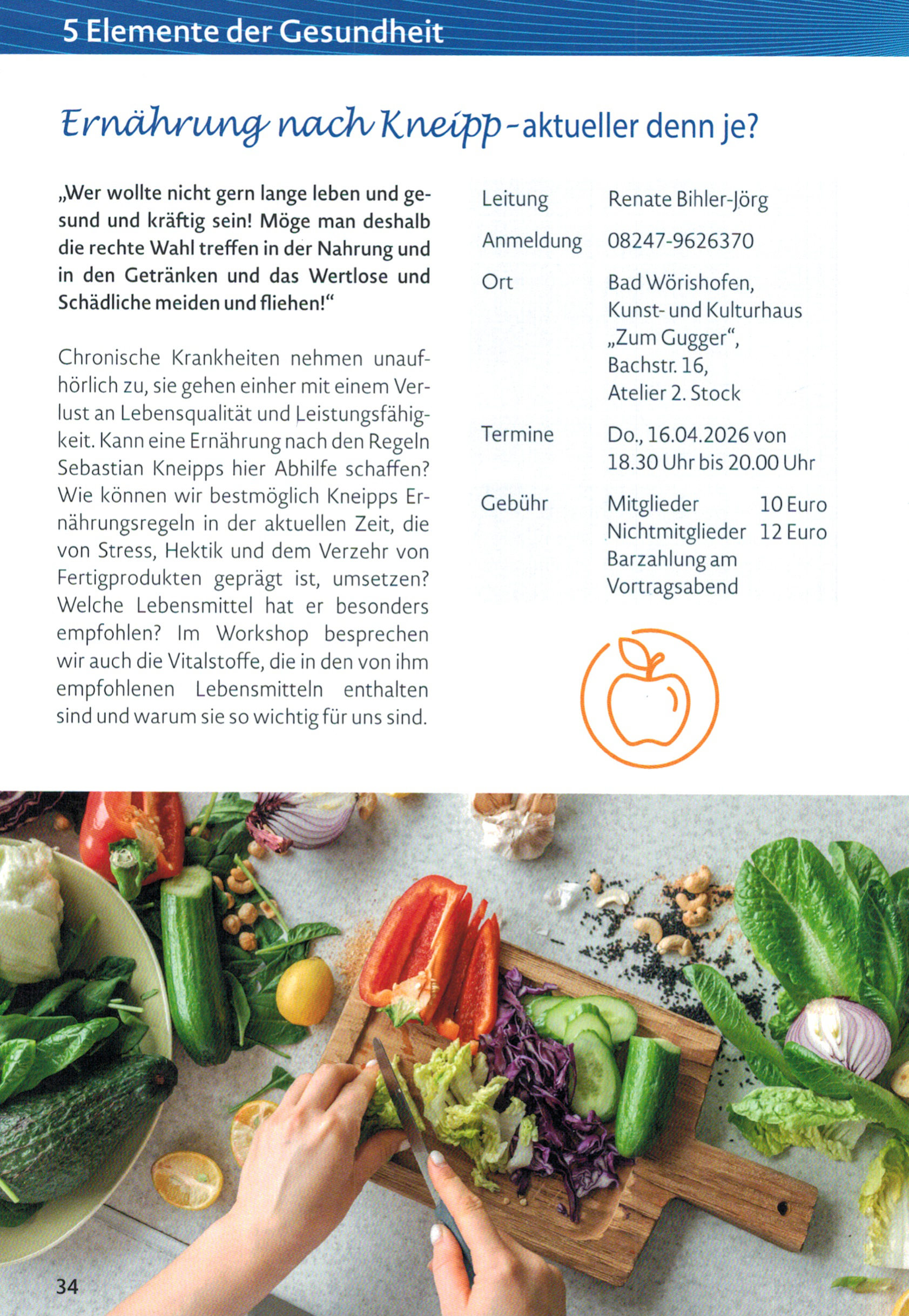 In Zusammenarbeit mit dem Stamm-Kneipp-Verein e.V., Bad Wörishofen, biete ich – unter drei laufenden Veranstaltungsreihen – saisonale Workshops mit wechselnden Inhalten an. Einen Veranstaltungskalender mit weiteren Infos finden Sie hier.
